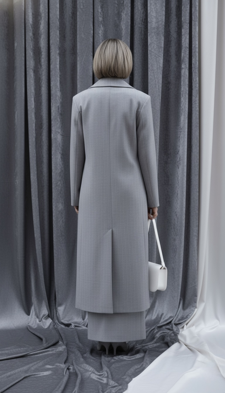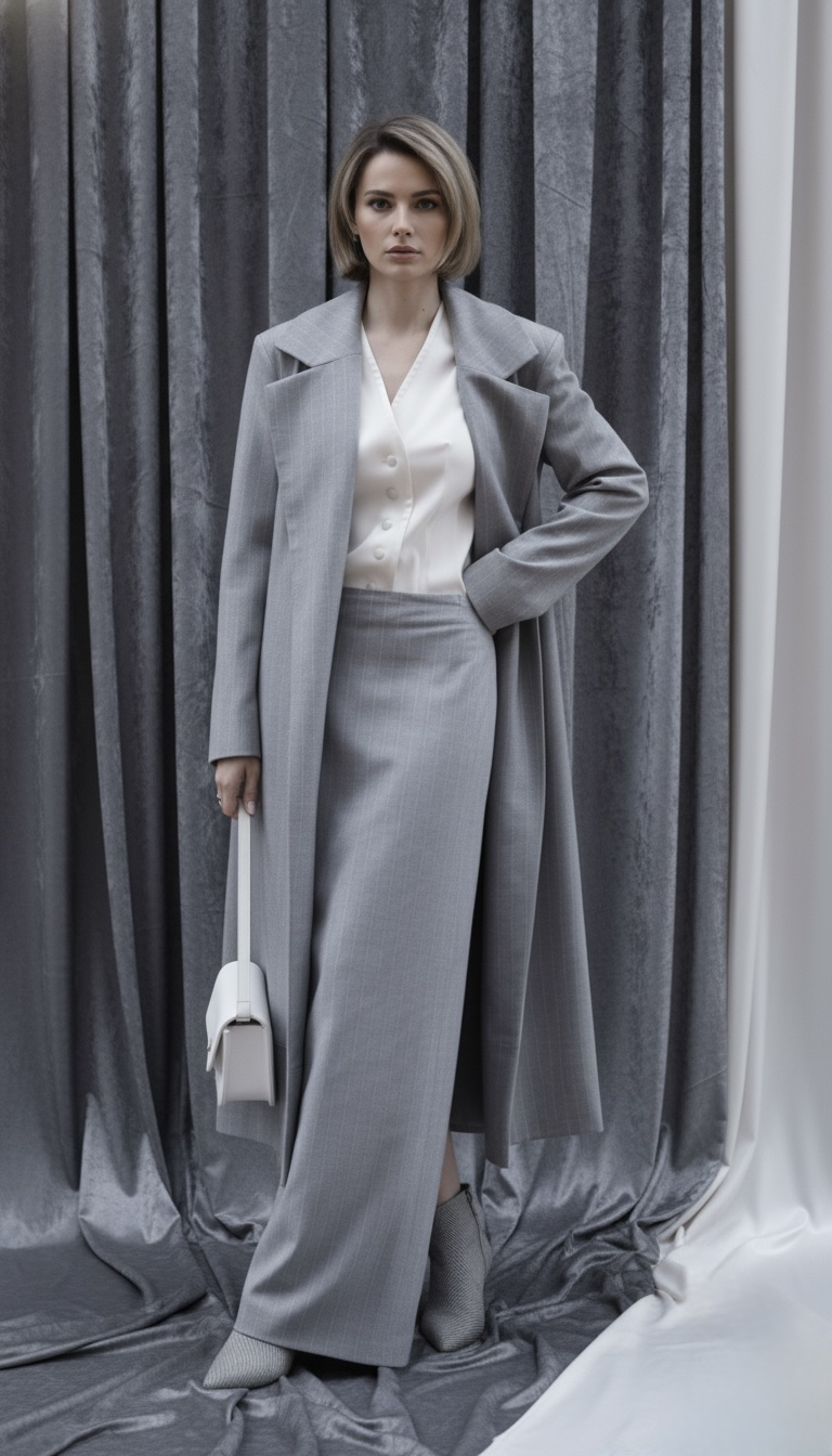 Setul poate fi purtat atât în zilele mai răcoroase de toamnă, cât și iarna, aducând o notă de sobrietate chic și versatilitate garderobei tale. Cu un croi lejer, fusta lungă se mulează elegant pe linia corpului, în timp ce paltonul lung oferă o siluetă alungită și un aer profesional.