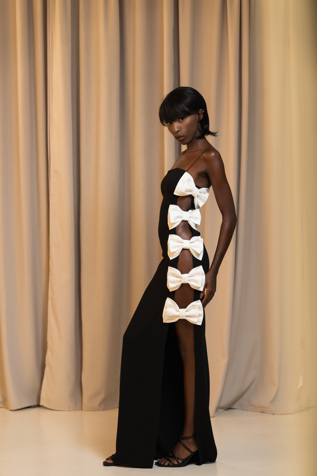 Bowline Affair surprinde contrastul perfect dintre croiala minimalistă și accentele dramatice. Realizată din crep elastic de înaltă calitate, această rochie midi îmbrățișează linia corpului și seduce prin tăietura adâncă cu slit lateral și detaliile feminine ale fundelor albe. Spatele gol și linia fluidă o transformă într-o alegere sofisticată pentru serile în care vrei să lași amprenta ta.