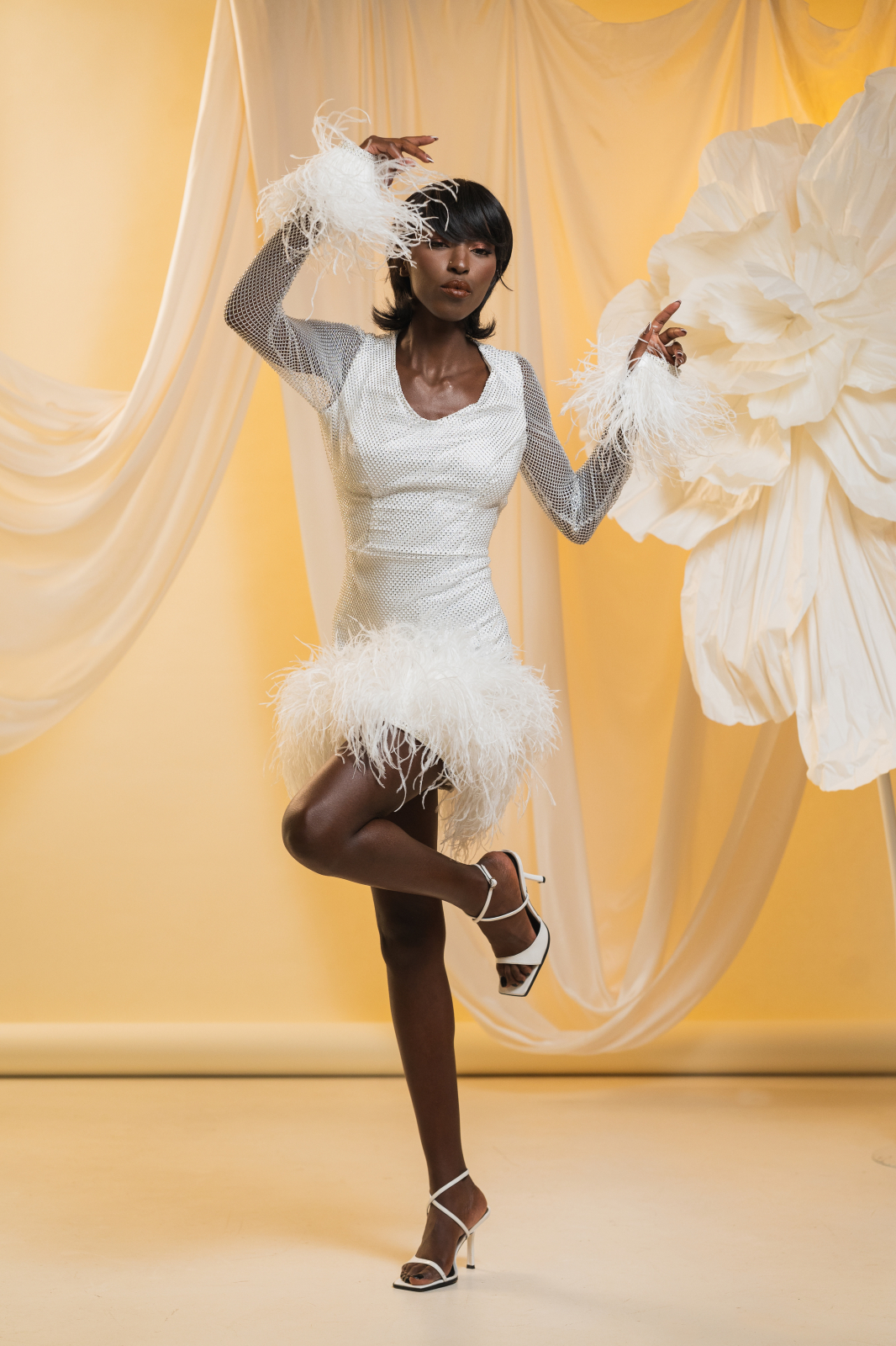 Pene de struț aplicate pe manșete și tiv pentru efect dramatic