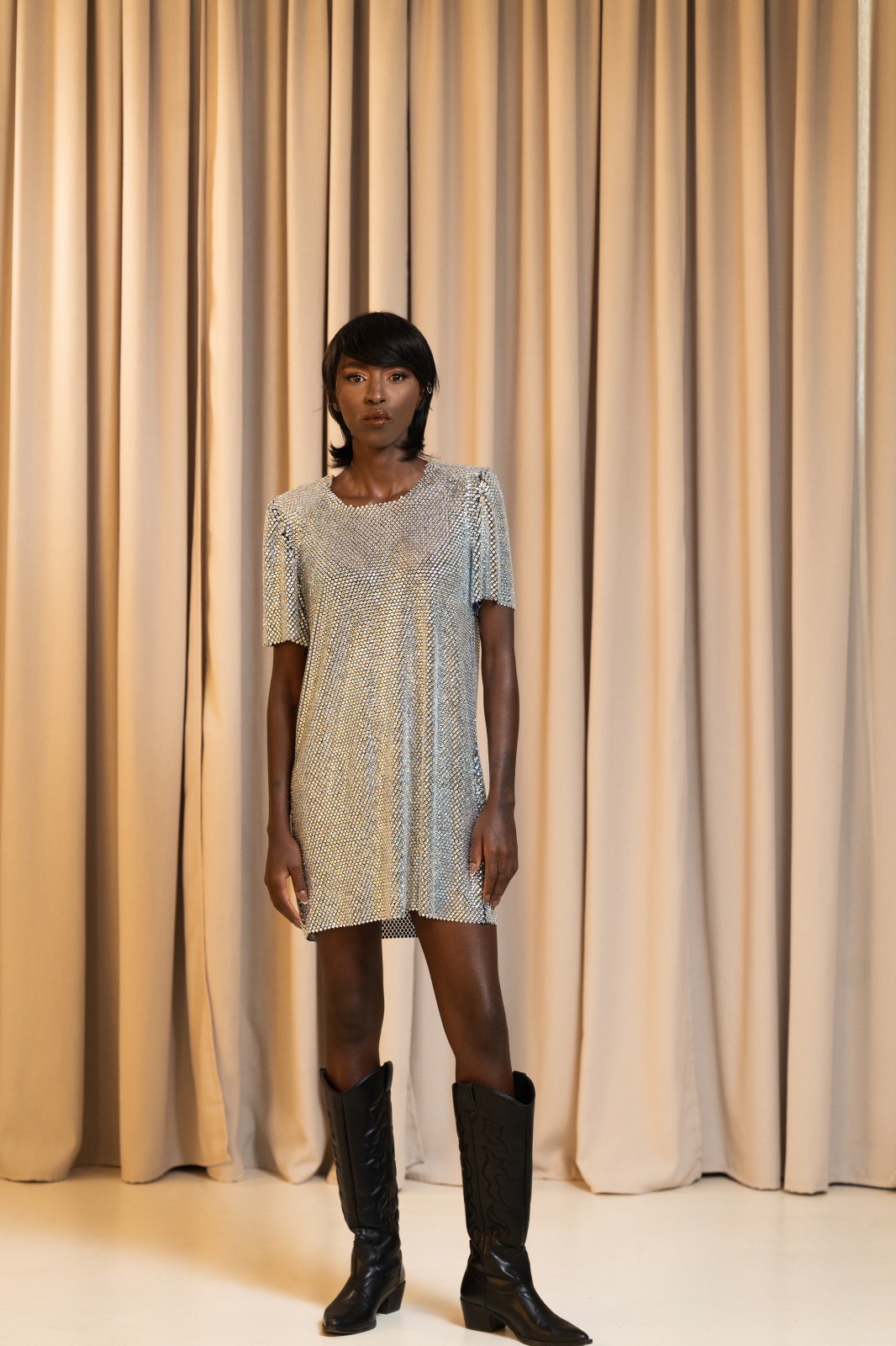 Acest tricou statement este realizat integral din aplicații de pietre cu luciu metalic subtil, oferind o eleganță sculpturală și magnetică. Croiala lejeră și mânecile scurte drapate îl transformă într-o piesă sofisticată dar purtabilă — ideal pentru evenimente de seară, petreceri sau apariții red carpet.